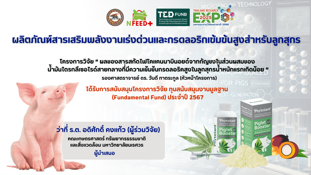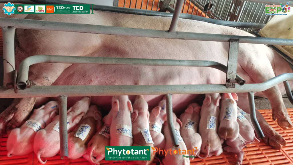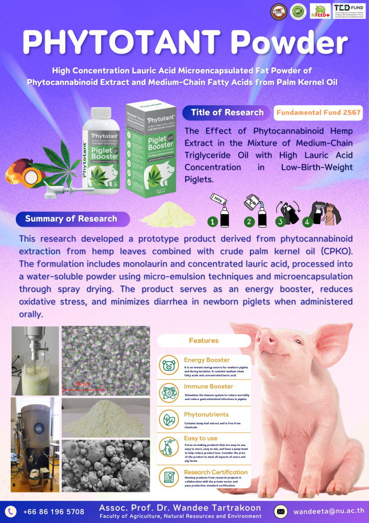 ผงไฟโตแทนท์ (PHYTOTANT Powder) สารเสริมพลังงานแบบเร่งด่วนสำหรับลูกสุกรแรกคลอด ซึ่งเป็นผงไขมันที่มีกรดไขมันสายกลาง – กรดลอริกเข้มข้นสูง และมีสารสกัดจากใบกัญชงเป็นส่วนผสม