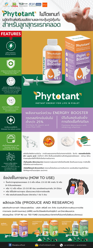 ผลิตภัณฑ์พลังงานเร่งด่วนสำหรับลูกสุกร ช่วยลดอาการท้องเสีย มีส่วนประกอบของกรดลอริกเข้มข้น โมโนลอริน และมีสารสกัดจากสมุนไพร